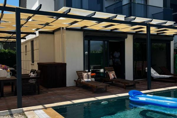 „Dokumentnummer der Wohngenehmigung des Ministeriums für Kultur und Tourismus: 48-1134“ Über HK Serenity Villa Die in Calis, einer der beliebtesten Gegenden von Fethiye, gelegene Villa Serenity HK mit 3 Schlafzimmern und privatem Pool ist die perfekte Wahl für Familien und Gruppen von Freunden. Am Eingang empfängt Sie eine wunderschöne Landschaft, ein Pool in perfekter Größe und ein Garten, der Ihnen das Gefühl gibt, in einem 5-Sterne-Hotel zu sein. Es hat einen sicheren und schattigen Parkplatz, auf dem 2 Autos problemlos Platz finden, und es hat eine automatische Tür. Die HK Serenity Villa bietet eine wunderbare Unterkunft und einen wunderbaren Urlaub und wurde so gestaltet und eingerichtet, dass Sie einen kompletten Villenurlaub erleben können. Unsere Villa, in der Sie sich in einer sehr komfortablen Umgebung befinden und den Komfort Ihres Zuhauses nicht suchen werden, hat 3 Etagen und verfügt über eine geräumige und breite Nutzungsfläche. Da es direkt an der Ecke liegt, wird es nicht von anderen Villen eingeengt und bietet eine großzügige Nutzungsfläche. Unsere Villa, von der Sie den Pool- und Gartenbereich nicht verlassen möchten, wurde am 1. Juni 2022 für diejenigen geöffnet, die eine Elite-Unterkunft suchen. 1. Schlafzimmer: Es gibt ein Doppelbett, Nachttisch, Kleiderschrank, Klimaanlage, Balkon, Toilette und Badezimmer. 2. Schlafzimmer: Es gibt ein Doppelbett, einen Kleiderschrank, eine Klimaanlage, einen Balkon, eine Toilette und ein Badezimmer. 3. Schlafzimmer: Es gibt zwei Einzelbetten, einen Kleiderschrank, eine Klimaanlage, ein Badezimmer und eine Toilette. Küche: In einer separaten modernen Küche gibt es einen Kühlschrank, eine Waschmaschine, einen Backofen, einen Herd, Geschirr, Besteck, Töpfe, Pfannen, Gläser und andere Küchengeräte. Wohnzimmer: Es gibt eine Sitzgruppe, TV, Klimaanlage, Esstisch. Es gibt auch ein Waschbecken im Erdgeschoss. Garten: Es gibt einen privaten Swimmingpool, Sonnenliegen, Sonnenschirm, Esstisch, privaten Grillplatz. Sicherheit: Zu Ihrer Sicherheit verfügt die HK Serenity Villa über eine Überwachungskamera und ein Alarmsystem. Sie können die Kameraaufzeichnungen während Ihres Aufenthalts überprüfen. +Informationen Alle Produkte wie Bettlaken, Pique-Kissenbezüge, Badetücher, Handtücher, Fußtücher werden von unserer Reinigungsfirma gewaschen und sauber an unsere Gäste geliefert, eine Zwischenreinigung erfolgt alle 7 Tage. Bei der Zwischenreinigung werden die Bettwäsche, Handtücher etc. unserer Wochenmietvilla durch neue ersetzt und das Badezimmer gereinigt. Die Zwischenreinigung ist ein Service, der unseren Gästen angeboten wird, die 14 Tage oder länger in unseren Mietvillen bleiben. +Alternative Optionen Wir empfehlen unseren Gästen, die nach alternativen Unterkünften in der Region suchen, die Villa Duha zu überprüfen.