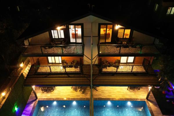 '' Ministry of Culture and Tourism Housing Permit Document Number: 48-239 '' Villa La Perla, located in the Kirme area of Oludeniz Faralya village, has a one-bedroom accommodation capacity for 2 people. Located in a very special area with a stunning and delightful view, this villa is a private villa where you will experience unforgettable moments with the combination of unlimited nature and ocean views with a beautiful sunset. Villa with indoor pool is suitable for honeymooners and nuclear families. All details in the villa, which has a jacuzzi in the bedroom, have been designed for your comfort. In addition, the pool area of our villa with wooden architecture is completely sheltered from the wind and is accompanied by a unique sea view. It has been carefully designed for our guests who seek peace in nature. Our villa, where you will wake up to the sounds of birds accompanied by a lush forest and sea view, and enjoy a unique breakfast, will make you feel that you have made the right choice from the first step with its unique view. Facilities that can fully meet your holiday expectations. 1st bedroom: double bed, jacuzzi, air conditioning Living room: living room, air conditioner, television Kitchen: toaster, microwave, dishwasher, refrigerator, kettle Garden: swimming pool, sun loungers, barbecue area, parasol