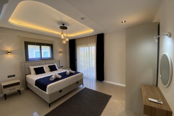 '' Ministry of Culture and Tourism Housing Permit Document Number: 48-1225 '' Our villa, which is the perfect choice for large families and groups of friends, is located in Hisarönü. Easy access to entertainment venues, restaurants and markets. The huge Pergola by the pool provides a great outdoor space for guests. There is free wifi in the villa and transfer can be arranged if requested.Villa Secret Blue is one of the excellent options we offer our vacationers to experience unforgettable moments. 1. Bedroom: There is a double bed, baby bed, bedside table, wardrobe with mirror and drawers, air conditioning. 2. Bedroom: Double bed, bedside table, wardrobe with mirror, air conditioner. 3. Bedroom: There are two single beds, two single beds, bunk beds, bedside tables, wardrobe, air conditioning. 4.Bedroom: There is a double bed, bedside table, wardrobe, air conditioner, 5.Bedroom: There is a double bed, bedside table, wardrobe with mirror, air conditioner, 6. Bedroom: Two single beds, wardrobe, air conditioner Kitchen: Refrigerator, dishwasher, oven, stove, kattle, dinnerware, cutlery set, pots, pans, glasses and other kitchen equipment are available. Living Room: There is a 8-person Dining Table, air conditioning and TV as well as Sitting Groups. +Region Hisarönü, which is intertwined with restaurants, amusement parks and entertainment venues, is close to the city and Ölüdeniz, and is one of the developed settlements.