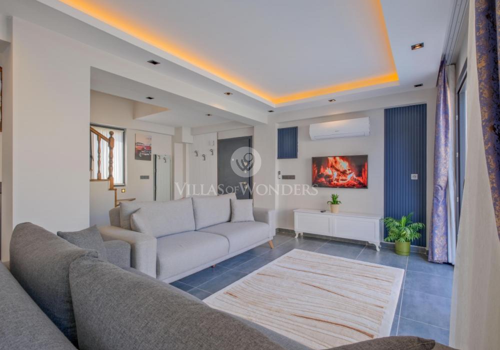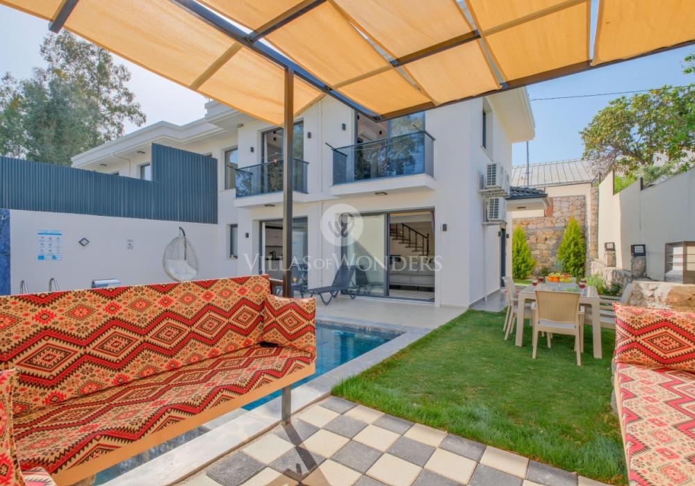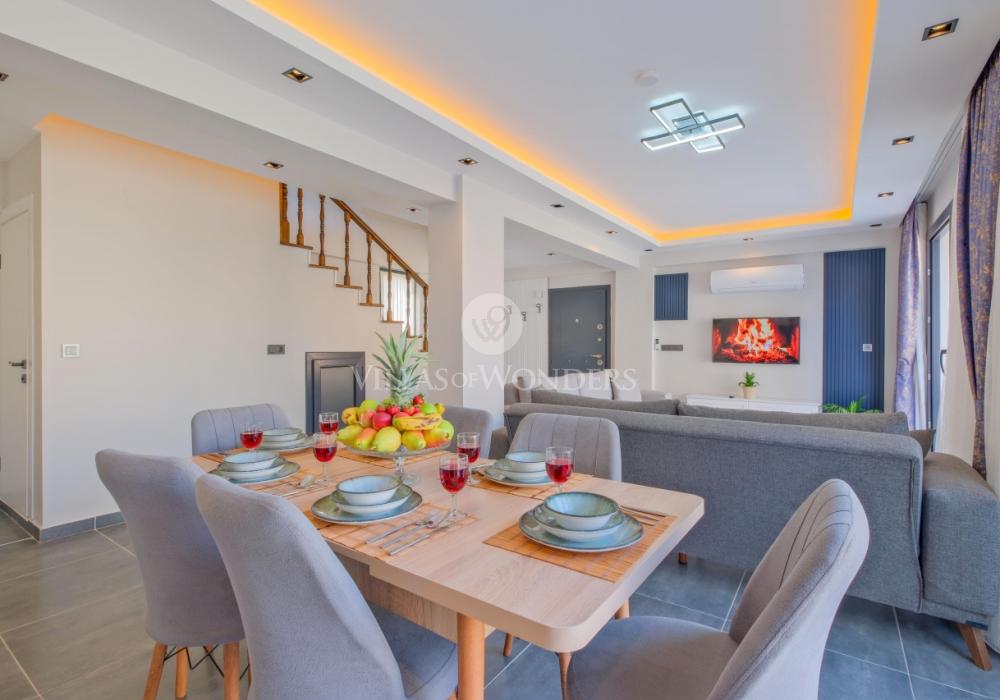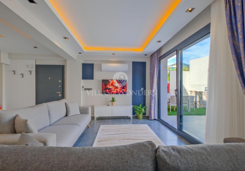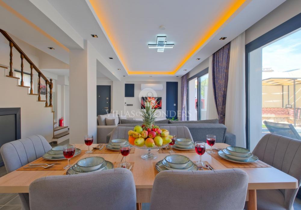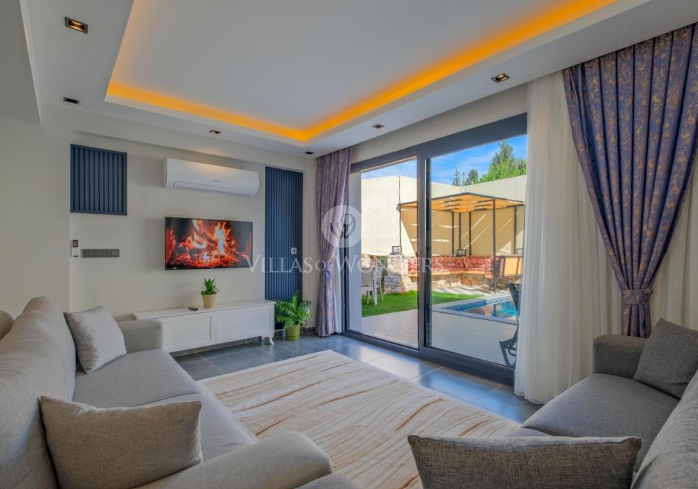 You can enjoy swimming in the private pool and make the most of the sunshine. The garden area includes sun loungers, a seating group, and a barbecue suitable for the villa’s capacity. The comfortable living room opening to the pool terrace and the fully equipped open-plan kitchen make your holiday even more enjoyable.