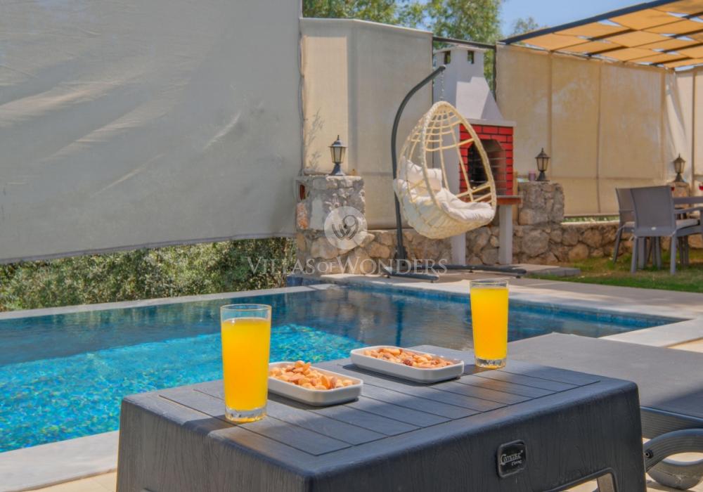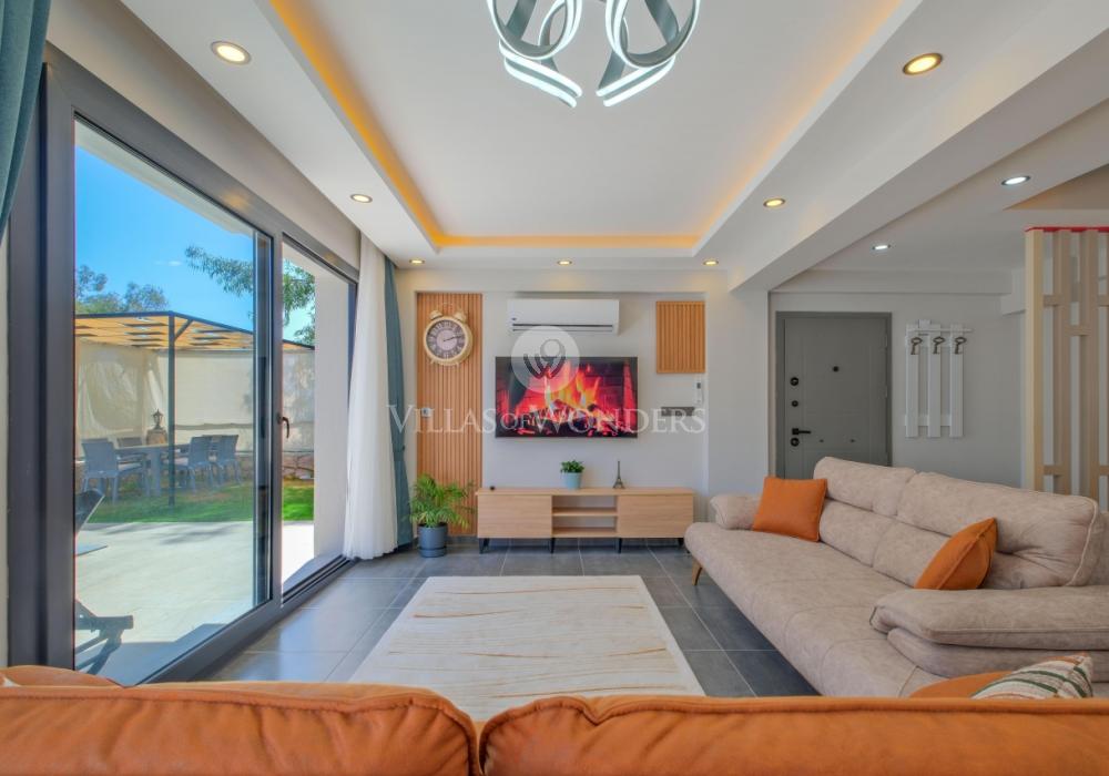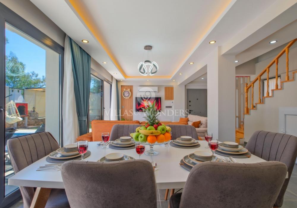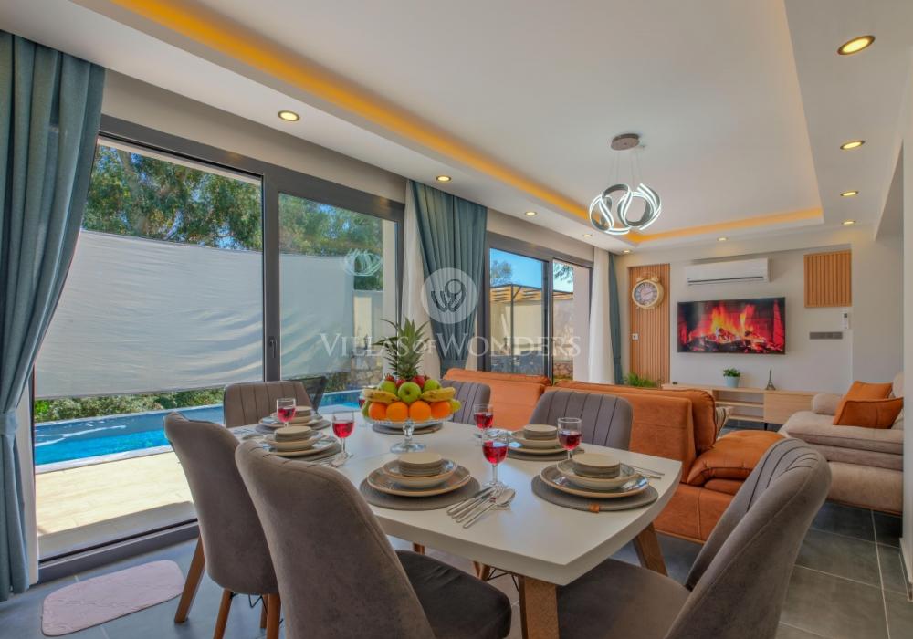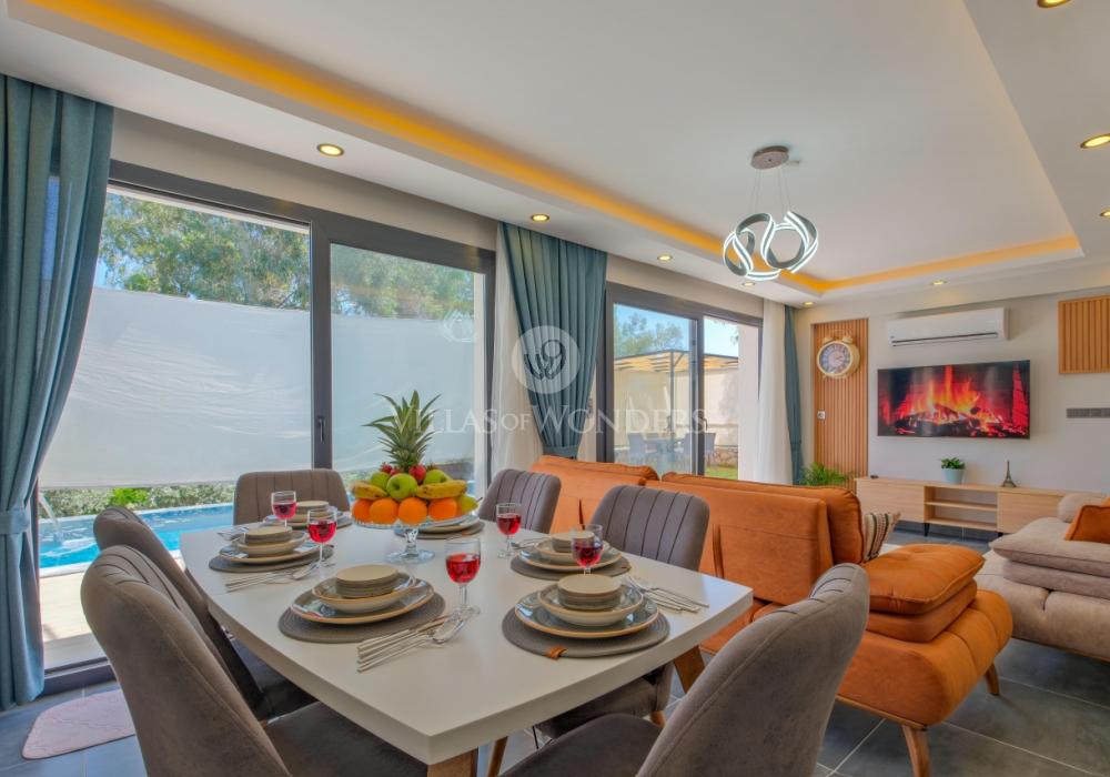 You can enjoy swimming in the private pool and relax under the sun. The garden area includes sun loungers, a seating group, and a barbecue area suitable for the villa’s capacity. The comfortable living room opening to the pool terrace and the fully equipped open-plan kitchen make your holiday even more enjoyable.