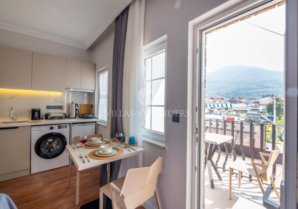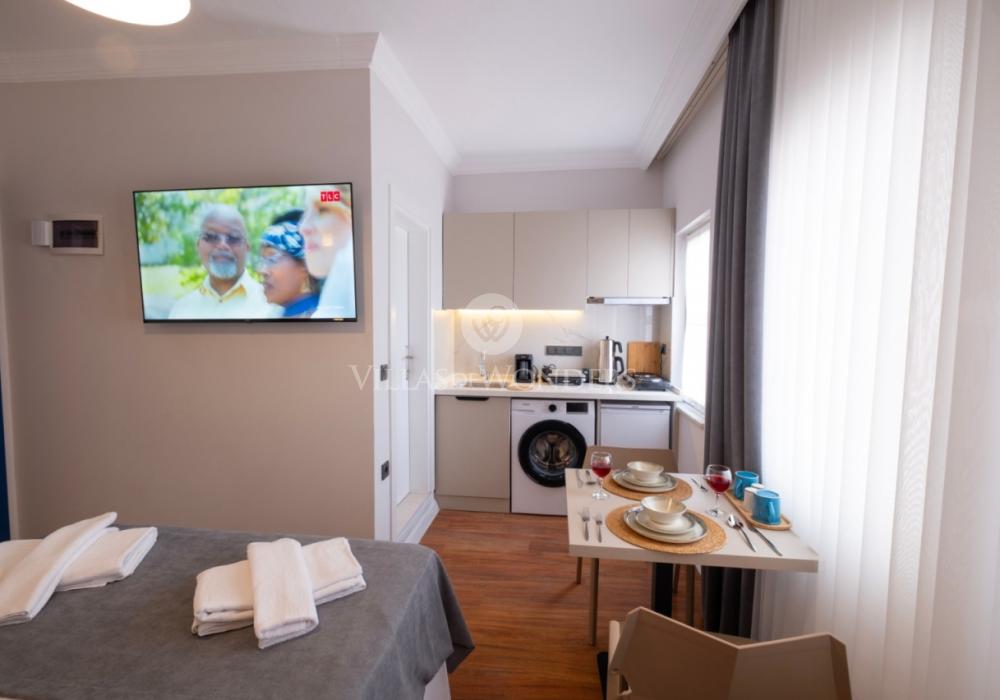 Konforlu iç mekanları, ferah yaşam alanı ve doğayla iç içe konumuyla tatilinize değer katacak olan apart, modern mutfak ve salon donanımlarıyla da öne çıkıyor: