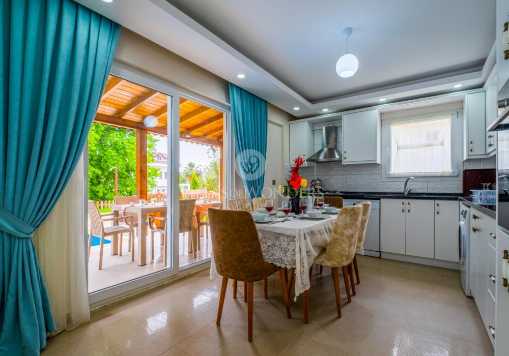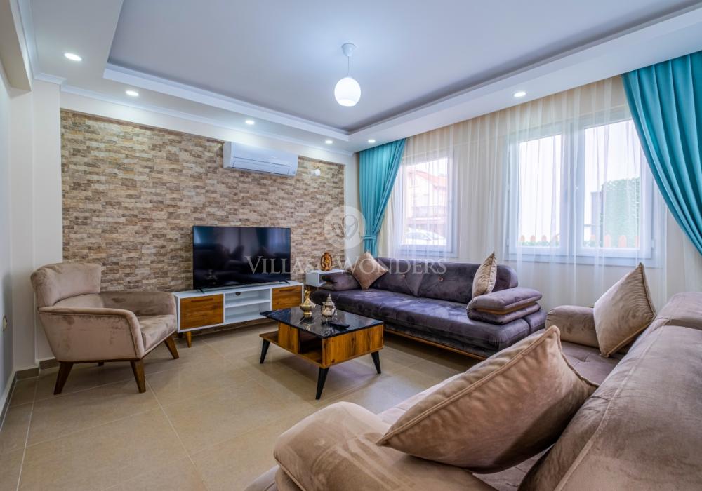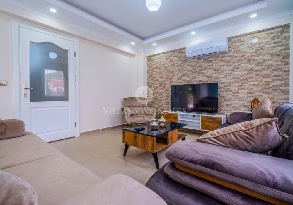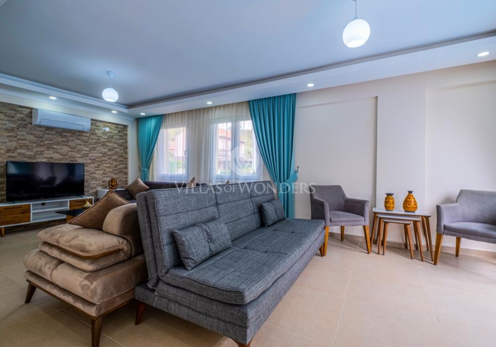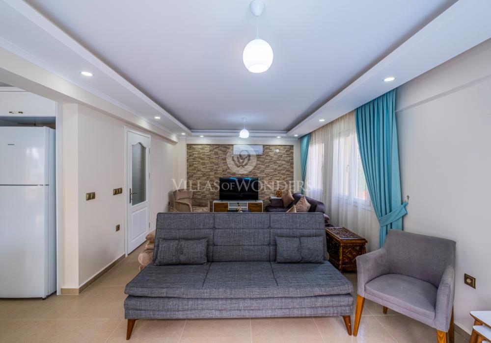 Açık mutfak planlıdır ve bir salonu (oturma odası) bulunmaktadır. Salonunda TV, oturma grupları ve yemek masası bulunmaktadır.
